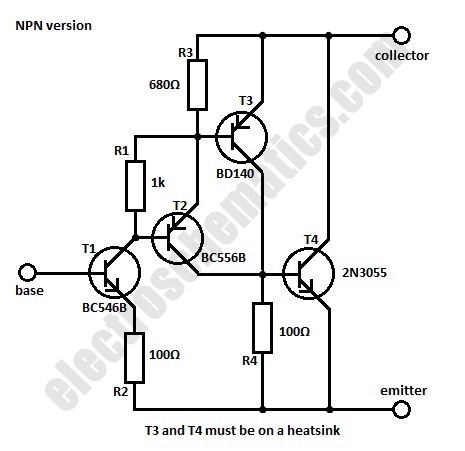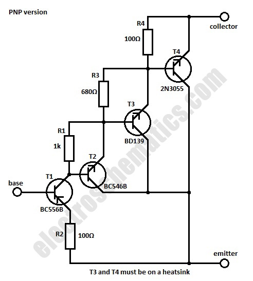 Sometimes we need a transistor with a different characteristic than the normal one for max voltage and current of the collector, maximum power dissipation and amplification. This can be done by using a combination of complementary transistors connected to work as a single NPN or PNP transistor.In the circuits given here we use four transistors for the NPN version of the high gain transistor and four the the PNP one. By choosing the best values for R1, R3 and R4 the total current amplification will be around 1.5 million. The characteristics of the circuit are essentially the same as the 2N3055 transistor.