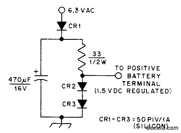 Simple rectifier circuit replaces battery in vacuum-tube voltmeter. Provides good regulation and eliminates need for frequent battery replacement. Remove battery before using supply. AC source can be 6.3-V secondary of filament transformer or terminals of 6.3-V pilot lamp in any AC equipment.-P. Alexander, Battery Replacement Circuit for VTVM, QST, Jan. 1976, p 42-43.