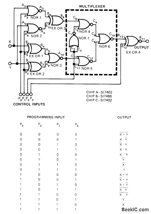 With only three IC chips, circuit provides choice of any one of 16 possible functions of two Boolean variables, Table shows output states for all programming combinations of control inputs P.-S. Murugesan, Programmable Logic Circuit Has Versatile Outputs, EDN Magazine, Feb. 5, 1975,p 57.