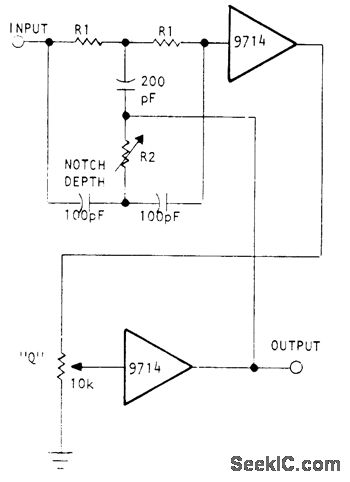 Used in commercial FM transmitters to eliminate 19-kHz program material from stereo encoder. Uses Optical Electronics 9714 opamp in circuit that gives unity passband gain below center frequency, 0.7 gain above center frequency, and Iess than 0.001 gain at notch frequency. Provides adjustments for notch rejection level and Q. R1 is 84K, and R2 is 36K in series with 10K pot.- Precision Notch Filter, Optical Electronics, Tucson, AZ, Application Tip 10255.