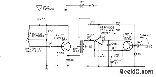 Simple low-power AM transmitter uses low-impedance output transformer in reverse to drive 2N107 oscillator stage for shortrange voice transmissions.-Circuits, 73 Magazine, June 1977, p 49.