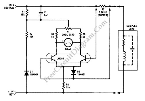 This watt-meter circuit has measurement range up to 1-KW. This circuit can give the complete (X)(Y) function although uses only one transistor. Actually, this circuit is used for 117 Vac±50 Vac operation. For lower or lower voltage, this circuit can be modified easily. This circuit only measure power on negative cycles. The advantages of this circuit is this circuit does not need external power supply. This circuit measures true power that is delivered to the load. Here is the schematic diagram of the circuit: