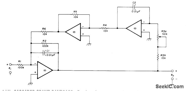 Bandwidth of only 71 Hz is achieved by using four identical three-opamp filters in series, for increased selectivity in communication or RTTY receiver. Values for R1 and R2 are made variable for first filter stage, but pot is used for R3 in all four stages so they can betuned to same center frequency. Batteries are used for supply, asfilter draws only 17 mA.-F. M. Griffee, RC Active Filters Using Op Amps, Ham Radio, Oct. 1976, p 54-58.