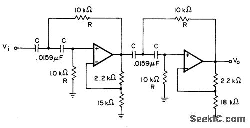 First section is second-order high-pass filter having gain of 1.2 dB,and second section has gain of 7 dB Opamps are 741 or equivalent.-H.M.Berlin, Design of Active Filters, with Experiments, Howard W. Sams, Indianapolis, IN, 1977, p 116-117.