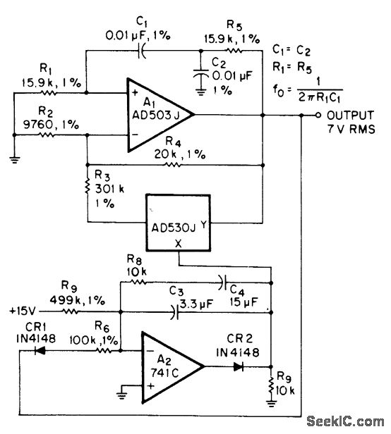 Total harrnonic distortion is only 0.01% in amplitude-stabilized oscillator delivering 7 VRMS. Opamp A1 has closed-loop gain of 3. Regenerative feedback through bandpass filter C1-C2-R1-R5 determines frequency of oscillation. Output is stabilized by multiplier whose control voltage is derived from integrator A2.-R. Burwen. Ultra Low Distortlon Oscillator. EDN/EEE Magazine. June 1. 1971. p 45.