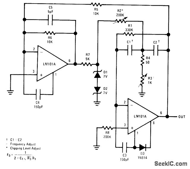 Opamp at right is driven by dquare-wave output of comparator at left, with feedback between opamps providing oscillation. Frequency range covered by tuning control R3 is determined by equalvalue capacitors C1 and C2, which range from 0.4 μF for 18-80 Hz to 0.002 μF for 4.4-20 kHz. Distortion rangesfrom 0.2% to 0.4% when 20% clipping of sine wave is provided by zeners.Both positive and negative supplies should be bypassed with 0.1-μF disk ceramic capacitors.- Easily Tuned Sine Wave Oscillators, National Semiconductor, Santa Clara, CA, 1971, LB-16.