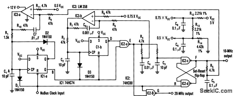 The 20-MHz clock phase-locks to Apple's Mac II 10-MHz NuBus clock. It uses a simple, inexpensive CMOS circuitry to generate 10- and 20-MHz square waves. The output duty cycle settings are insensitive to VCC variations. The input to the circuit is a NuBus clock signal with specifications that call for a 75 percent duty cycle at 10 MHz-a square wave that's high for 75 ns and low for the remaining 25 ns. To generate the 20-MHz signal, the circuit produces a 25-ns negative-going pulse, delayed 50 ns from the falling edge of the 10-MHz NuBus clock input at point E. NORing that pulse with the NuBus clock produces the 20-MHz clock at point G. Finally, applying the 25-ns pulse to the set input of a set-reset input, results in a 10-MHz square wave at F.