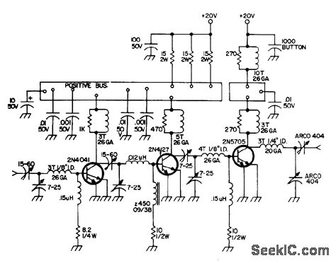 Input of 200 mW is amplified to 20 VV. Positive 20-V sources are separated so final stage can be amplitud-modulated; for FM, connect to single supply.Transistors require heatsinks.-Circuits, 73 Magazine, May 1973, p 106.