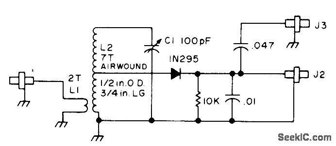 Covers 6-meter band and most 2-meter FM receiver oscillators near 45 MHz. Circuit is essentially that of crystal detector. Jack J3 gives AF output, and J2 gives DC output for meter.-B. Hoisington, Tuned Diode VHF Receivers, 73 Magazine, Dec. 1974, p 81-84.