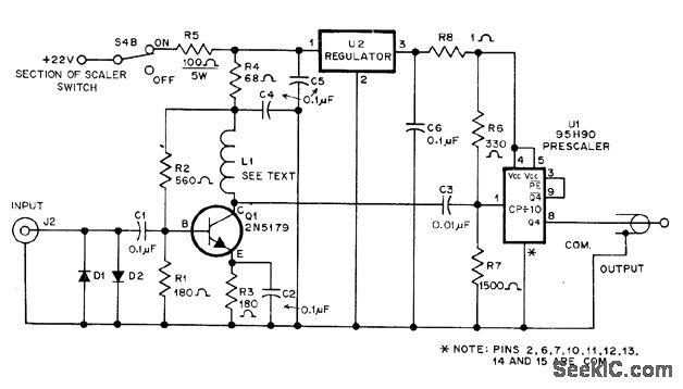 Based on use of Fairchild 95H90 decade counter, with preamp Q1 and associated components selected for 25-250 MHz range. 1N914N diodes prevent over-loading of input. Voltage regulator is LM340T-5, L1 is 8 tums No. 28 wound on body of 1000-ohm or larger 1/2-W resistor, with ends soldered to resistor leads. Quarter.wave whip antenna at inputwill pick up adequate signal from 1-W 146-MHz transceiver hand-held 6-10 feet away.Counter provides division by 10.-R. D. Shriner, Prescaler Updates the DVM/Frequency Counter, QST, Sept. 1978, p 22-24 and 37.