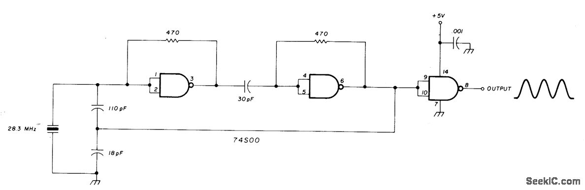 Third-over-tone crystal oscillator uses 74S00 Schottky TTL quad NAND gates acting as oscillator and output buffer to increase output amplitude. Output swing is from about 0.4 to 3.5 V P-P, as required for TTL. No inductors are required.-C. Hall, Overtone Crystal Oscillators Without Inductors, Ham Radio, April 1978, p 50-51.
