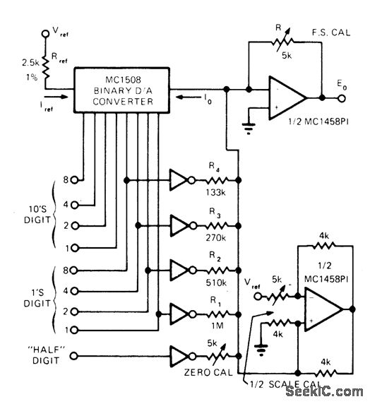 Addition of 1/2-digit circuit to basic 2-digit BCD DAC increases countfrom 99 to 199,Circuit sequencesto 99 while 1/2-digitsection of MC14009 hex two-output NOR gate has low output, and goes through steps 100 to 199 while 1/2-digit output is high Reference voltage is 5.0 V. Calibration procedure is given.—T.Henry,Binary D/A Converters Can Provide BCD-Coded Conversion,EDN Magazine, Aug.5, 1973, p 70-73.