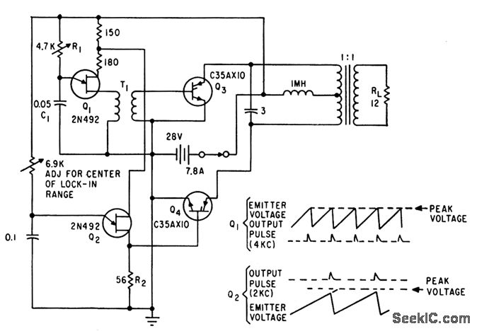 Circuit shows parallel inverter, but unijunction relaxation oscillators Q1and Q2 could also trigger series inverter, giving symmetrical operation. Q1 operates at twice the frequency of Q2.-D. V. Jones, Turn-Off Circuits for Controlled Rectifiers, Electronics, 33:32, p 52-55.