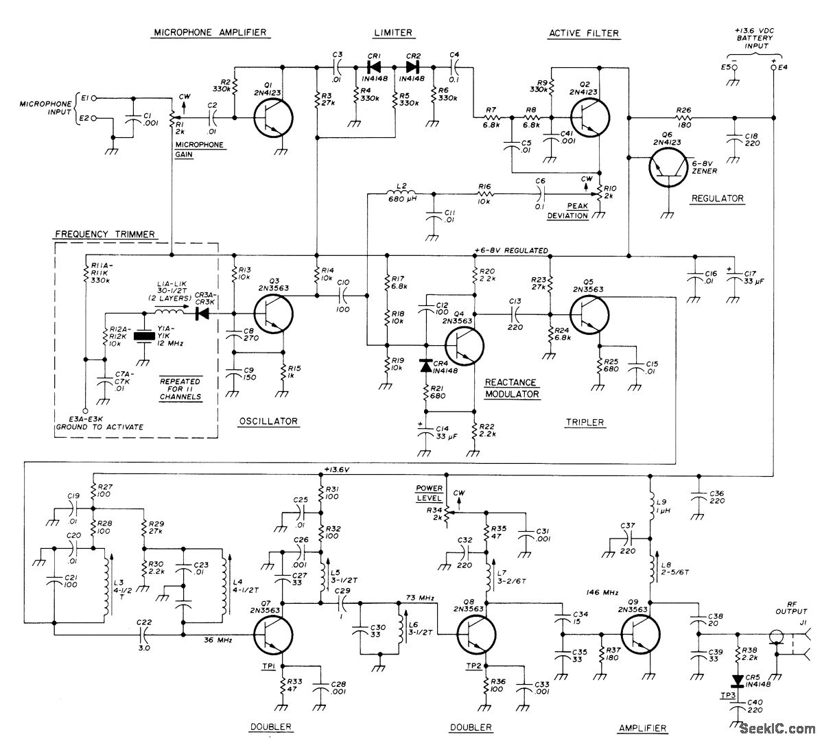 Includes both deviation and microphone gain controls. Low-pass filter following limiter eliminates raspy voice signal. Input takes either carbon or transistor-amplified dynamic microphones. Phase modulation used is suitable for multichannel operation and frequency synthesizers. Oscillator uses 12-MHz series-resonant crystals. Voltage regulator for oscillator, modulator, and audio stages minimizes effects of line-voltage variation and noise. Output power of 150-200 mW is enough to drive new TRW and Motorola RF power modules. Article gives construction and alignment details.-J. Vogt, High-Performance Two-Meter FM Exciter, Ham Radio, Aug. 1976, p 10-15.