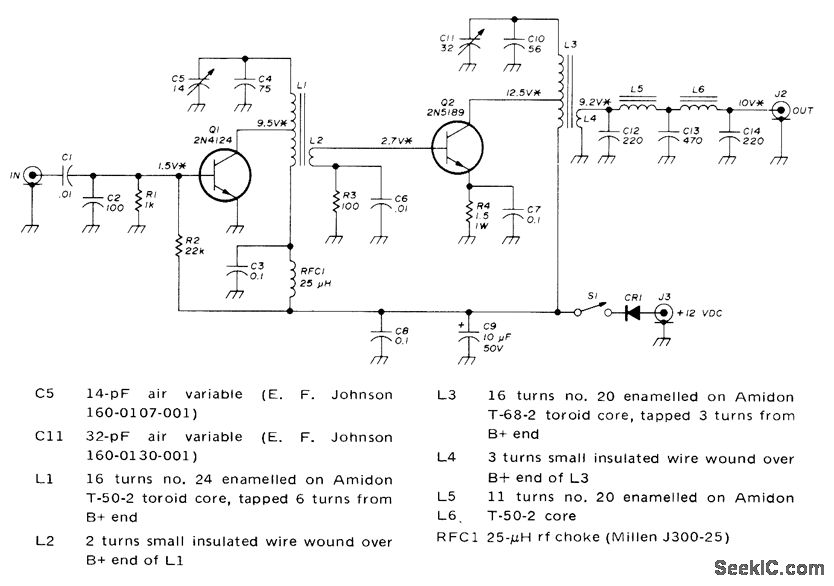 Motorola 2N4124 driver operates as class B amplifier. With no signal, collector current is near zero, minimizing current drain when key is up. Tank circuit of RCA 2N5189 final is similar to that of driver. Double-pi network in output assures good harmonic attenuation. RMS values of BF voltages are marked with asterisks. Protective diode CR1 is any silicon rectifier. For portable use, supply can be lantern battery.-C. E. Galbreath, Low Power Solid-State VFO Transmitter for 20 Meters, Ham Radio, Nov. 1973, p 6-11.