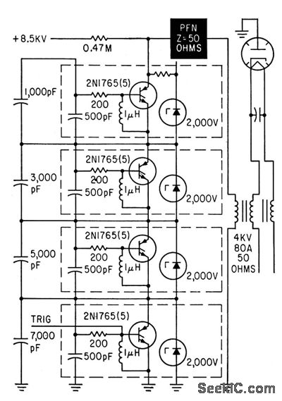 Trigger is applied to first of four 2-kv switch modules arranged in series, for simultaneous triggering of other modules to furnish 16-kv 20-amp pulse to type 7208 Ku-band coaxial magnetron through standard 50-ohm pulseforming network PFN.-F. A. Gateka and M. L.Embree, Semiconductor Modulators for Modern Magnetrons, Electronics, 35:37, p 42-45.