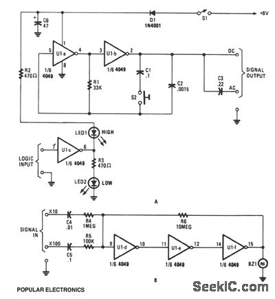 This circuit is designed around a 4049 hex inverter/buffer. Two inverters are used in a dual-frequency signal-injector circuit, another inverter is used as a logic probe, and the remaining three inverters are used as a sensitive dual-input, audio-signal tracer.The signal-injector potion gates are configured as a two-frequency, pulse-generator circuit. Under normal conditions, the generator's output frequency is around 10 kHz, but when S2 is closed, the output frequency drops to about 100 Hz. The logic-probe potion is made up of U1c, the output of the inverter decreases. The low output of U1c reverse biases LED2, so it remains off. That low output also forward biases LED1, causing it to light. But when a logic low presented Ulc's input, the situation is reversed, so LED2 lights and LED1 darkens.The audio-signal tracer portion is made up of the three remaining inverters which are configured as a linear audio amplifier to increase the input signal level by a factor of 10 or 100. The amplified output signal feeds a miniature piezo element of audible detection.