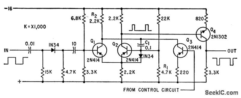 One-shot mvbr Q1-Q2 triggered by input signal, and Q3 controlled by error-detecting signals at output of static inverter, together determine delay at output of Q4.Complete inverter uses six identical delay circuits together with solid-state servo loops to control output voltages and phase angles despite unbalanced loads.-T. J. Gilliam, Three-Phase Inverter with Feedback Loops, Electronics, 35:12, p 48-5l.