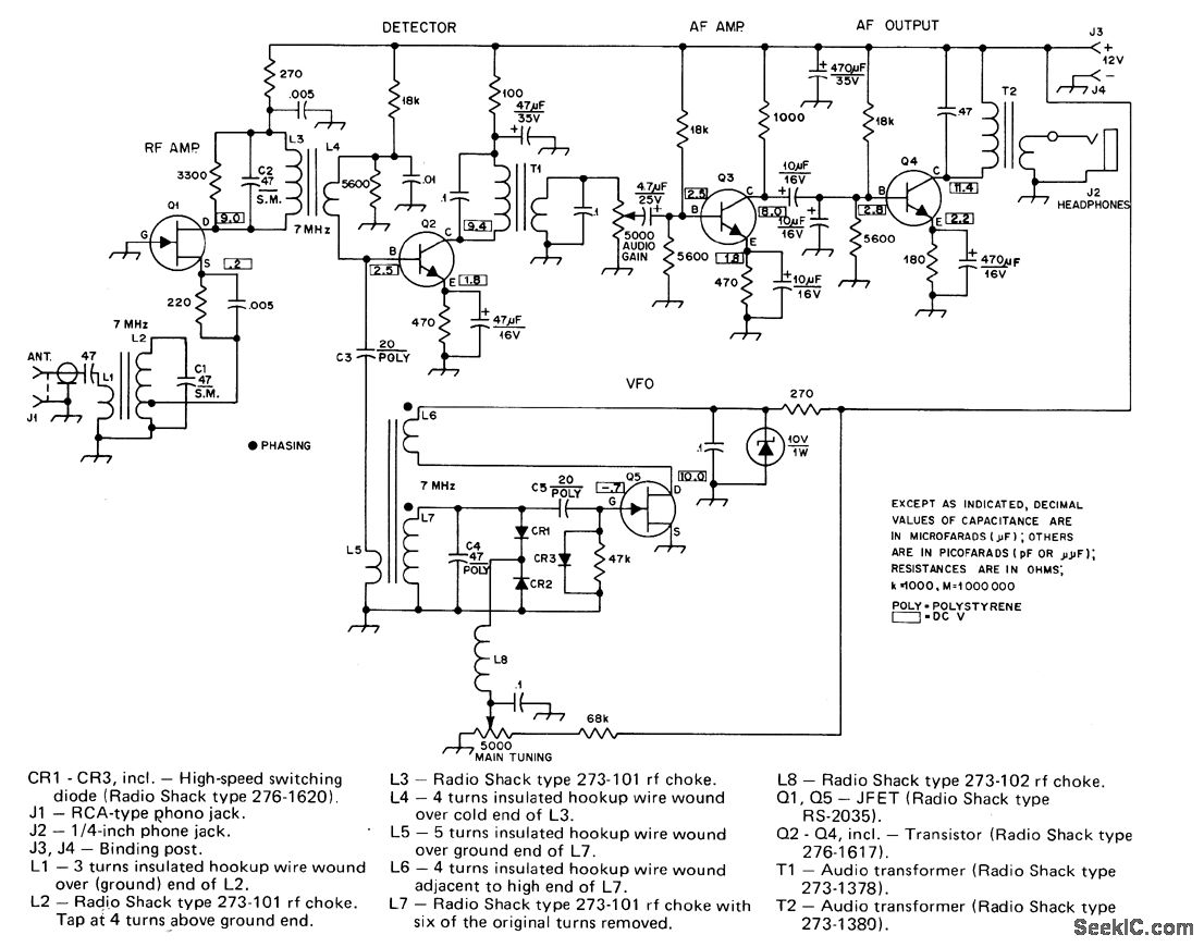 Simple, foolproof circuit design uses discrete components mounted on printed-circuit board shaped to fit in oval herring can. Single 7-MHz RF stage and voltage-tuned VFO feed produgt detector Q2 that drives 2-stage AF amplifier having peak response at about 650 Hz for most comfortable CW listening. VFO uses Armstrong or tickler-feedback circuit, with CR1 and CR2 connected as voltage-variable-capacitance diodes. Zener regulator powers VFO circuit for good frequency stability Receiver will tune any 100-kHz segment of 40-meter band.-J Rusgrove,The Herring-Aid Five,QST,July 1976,p 20-23.
