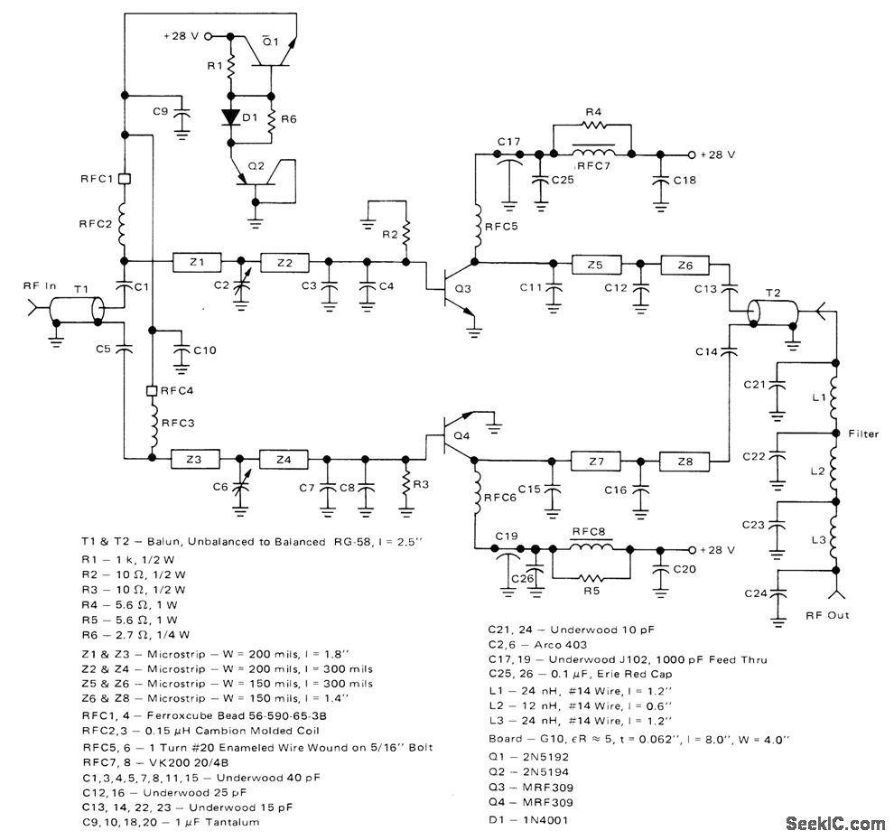 Two Motorola 3-inch lengths and prepare MRF309 transistors in pusffipull require only 16 and W drive to deliver 100 W for transmitter applications. Circuit provides 8 dB of power gain at efficiency greater than 40% when operating from 28-V supply. Harmonic suppression inherent in push-pull operation is enhanced by seven-element low-pass filter at output. Q1and Q2 are bias resistors and must be insulated from heatsink with mica washers. T1 and T2 are transformers constructed from RG58 coax. Use 1/4 inch at each end to give total transformer length of 21h inches.H. Swanson and B. Tekniepe, A 100-Watt PEP420-450 MHz Push-Pull Linear Amplifier, Motorola, Phoenix, AZ, 1978, EB-67.