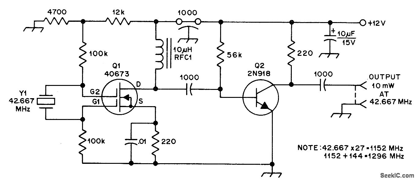 Unusual crystal-controlled oscillator, similar to modified Pierce oscillator that uses crystal between grids 1 and 2 of tetrode tube, can be used as local oscillator in VHF and UHF converters. No trimming ortuning is required to get overtone frequency. If fundamental of crystal is desired, increase RFC1 to 100 μH or replace it with 1K resistor. Stability is excellent. Circuit works well with supply as low as 4 V.-G. Tomassetti, Dual-Gate MOSFET Offers an Unusual Crystal-Controlled Oscillator Concept, QST, June 1976, p 39.