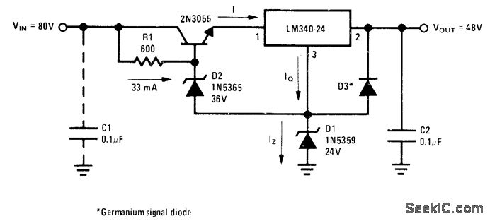Level-shifting transistorzener combination R1-D2 is used with zener D1 to keap voltage across LM340-24 regulator below maximum ratedvalue Addition of zenershas drawback of inoreasing output noise to about 2 mV P-P. Load regulation is 60 mV for pulsed load change from 5 mA to 1 A. Line reg-ulation is 0.01%/V of input voltage change for 500-mA load.- Linear Applications, Vol. 2, National Semiconductor, Santa Clara, CA, 1976, AN-103, p 10-11.