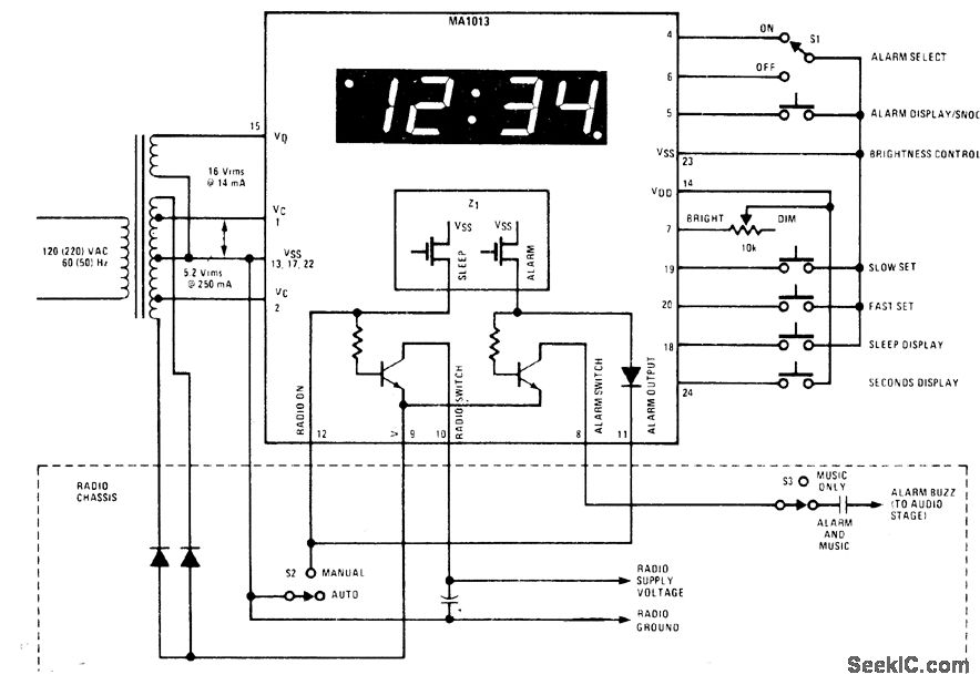 National MA1013 clock module contains MOS LSI clock IC, display, power supply, and associated discrete components on single printed-circuit board that is easily connected to radio. Operates from either 50-Hz or 60-Hz inputs, and gives either 12- or 24-h display format. Nonmulti-plexed LED drive eliminates RF interference.Display is flashed at 1-Hz rate after powerfailure of any duration, to indicate need for resetting dock. Zero appearing in first digit is blanked. On 12-h version, dot in upper left corner is ener-gized to indicate PM.- MOSiLSl Databook, National Semiconductor, Santa Clara, CA, 1977, p 13-23-13-28.