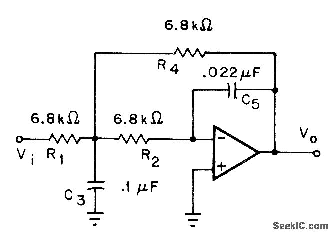 GAIN-Multiplefeedback filter using 741 or equivalent opamp has unity gain in passband below 500-Hz cutoff.Resistors can be 5% tolerance.-H. M, Berlin, Design of Active Filters, with Experiments, Howard W. Sams, Indianapolis, IN,1977,p 99-1O0.