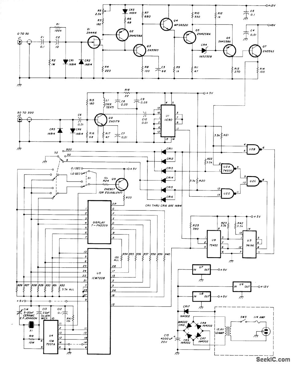 Circuit provides separate 0-50 MHz preamp Q1-Q7 and 50-500 MHz prescaler for Intersil IC M7207A 7-digit CMOS frequency counter. 500-MHz prescaler uses Fairchild 11C90 that drives TTL directly, with 2N5179 transistor as preamp. L1 and output capacitance of 2N5179 form low-Q resonant circuit. U3 is 50-MHz presealer for both preamps. Crystal frequency is 5.242880 MHz. 5-V regulators are MC7805, and 12-V regulator is MC7812. Article covers construction and adjustment.-J. H. Bordelon, Simple Front-Ends for a 500-MHz Frequency Counter, Ham Radio, Feb. 1978, p 30-33.