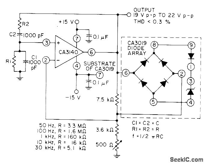 Wide-range audio oscillator utilizes high input impedance, high slew rate, and high voltage characteristics of CA3140 opamp in combination with CA3019 diode away. RI and R2 are same value, chosen for frequency desired as given in table.- Circuit Ideas for RCA Linear ICs, RCA Solid State Division, Somerville, NJ, 1977, p 4.