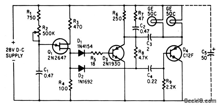 Provides 80 flashes per minute. Scr's conduct alternately in parallel inverter with capacitor commutation, and are triggered by free-running relaxation oscillator Q1. Flashing rate is determined by R1-R2-C1.-D. V. Jones, Quick-On-The-Trigger Design, Electronics, 38:12, p 105-110.