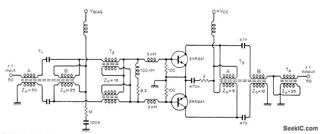 Single RF power amplifier stage uses broadband transmission-line transformers, operates between 50-ohm source and load impedances, and produces 50 W peak envelope power from 28-V supply over band of 2-30 MHz. Article gives design equations for toroid transformers.-W. P .Reilly, Transmitter Power Amplifier Design, Wireless world, Sept1975, p 417-422.