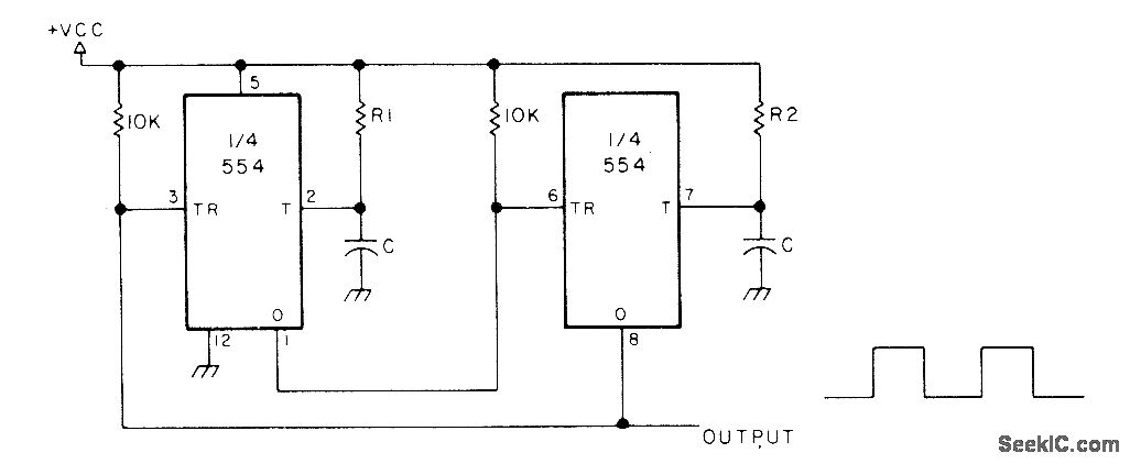 Two sections of 554 quad monostable timer are used. Output frequency is 1/ (R1 + R2) C hertz, and output duty cycle is 100R2/ (R1 + R2). When R1 is equal to R2, symmetrical square wave is obtained VCC is 4.5-16 V at 3-10mA.-H. M. Berlin, IC Timer Review, 73 Magazine,Jan. 1978, p 40-45.