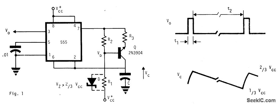 This free-running multivibrator uses an external current sink to discharge the timing capacitor, C. Therefore, interval t2 may easily be 1000 x the pulse duration, t1, which defines a positive output. Capacitor voltage, VC, is a negative going ramp with exponential rise during the pulse output periods.