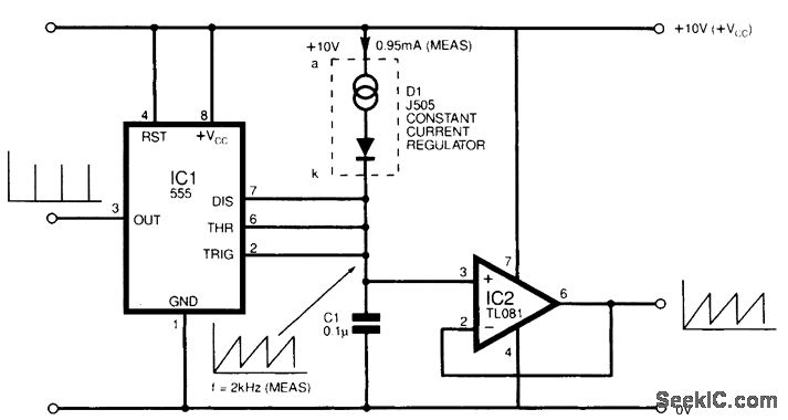 When the timing capacitor of an ordinary 555 circuit charges, an exponential curve across the capacitor results. Obviously, a fast-rising square wave is seen at the output. An accurate ramp voltage can be generated by the 555, though, by ignoring the square-wave output and sneakily using a constant-current source instead of the resistor charging network. The figure shows how a simple J505 constant-current diode can be used to create a reasonable ramp, which will be observed across the capacitor C1. D1 is specified at 1 mA nominal. Assuming that C1 is discharged initially, after power-up the 555 triggers (Vtring, <1/3 Vcc), and C1 starts to charge at a fixed rate through the constant-current source D1 until the threshold voltage of 2/3 Vcc is reached. Then the 555 (IC1) will rapidly discharge the capacitor into pin 7 down to1/3Vcc, when the chip will trigger again. With a 12-V rail, the result is a sawtooth waveform of 4 V p-p. A fast series of spikes is seen at pin 3.