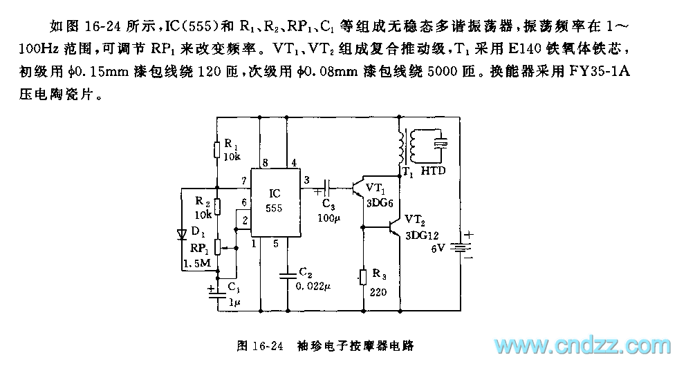 As the figure 16-24 shows, the astable multivibrator is composed of the IC(555) and R1,R2,RP1,C1, the oscillation frequency is between 1 to 100Hz, you can change the frequency by adjusting RP1. The composite promoting stage is composed of the VT1 and VT2, T1 uses the E140 ferrite core, the primary stage is binded with 120 turns of enamel insulated wire (the diameter is 0.15mm), the secondary stage is binded with 5000 turns of enamel insulated wire (the diameter is 0.08mm). The transducer uses the FY35-1A piezoelectric ceramic.