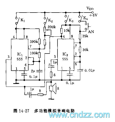 As the figure 14-27 shows, the multivibrator which is composed of two bipolar type 555s (or a 556) and the capacitance resistance elements can form a variety kinds of analog audio circuits. The oscillation frequency of IC1 is about 1Hz, the duty ratio is about 80%. The oscillation frequency of IC2 is about 1500Hz. By using the opening and closing of the switch, this circuit can simulate different sounds. For example, when you just turn on the K1, the IC1 starts working, the circuit will send out the monotonous second signal; if you just turn on the K4, the IC2 starts working, the circuit will send out the 1500Hz alarm signal; if you turn on the K3 and K4 at the same time, you can realize the modulation of IC1 to IC2, the circuit will send out the intermittently sound.