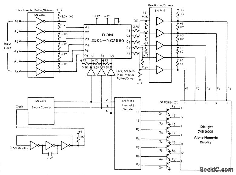 Drive for Dialight 745-0005 64-character alphamerle display generates desired character in response to pattern of 0s and 1s on input lines A1-A6. Timing of sequential scanning operation for seven horizontal rows of matrix is controlled by clock that drives binary counter having row-selecting outputs A, B, and C. Outputs C1-C5 of ROM correspond to vertical rows of dots enabled by 1-out-of-8 decoder.- Readout Displays, Dialight,Brooklyn, NY,1978,Catalog SG745,p 24-26.