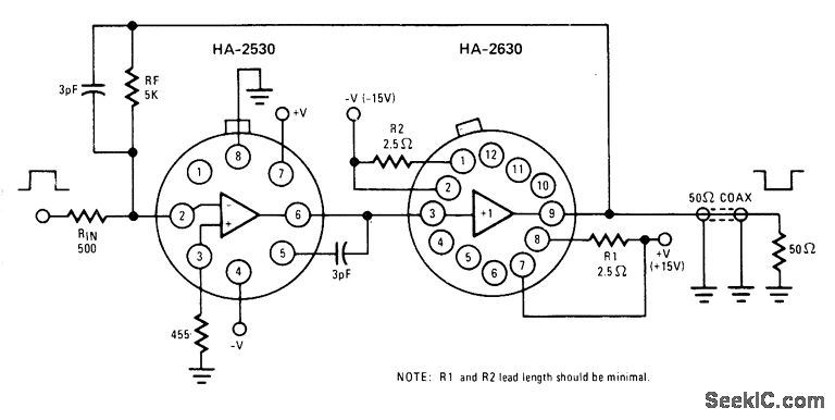 Combination of Harris HA-2530 wideband inverting amplifier and HA-2630 unity-gain current amplifier pro-vides 20-dB gain with extremely high slew rate and full power bandwidth even under heavy output loading conditions.- Linear & Data Acquisition Products, Harris Semiconductor, Melbourne, FL, Vol. 1, 1977, p 2-47-2-50.