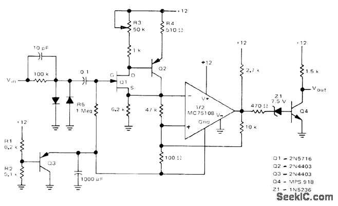 Used ahead of 5-MHz frequency counter to make input signal swing from logic 0 of 0 V to logic 1 of about 10 V as required for accurate counting of frequency for input signal having any input waveform shape and level. Input of front end has high impedance to minimize effect on input waveform. FET transistor Q1 and bipolar buffer Q2 drive Schmitt trigger using half of Motorola MC75:08 dual line receiver.-D. Aldridge, Battery-Powered 5-MHz Frequency Counter, Motorola, Phoenix, AZ, 1974, AN-717, p 5.