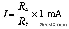 Rx is inserted h the feedback path of IC1.A known reference current is selected from reference voltage generator Q1,D1,and R5 through R9.A meter reading will be produced: