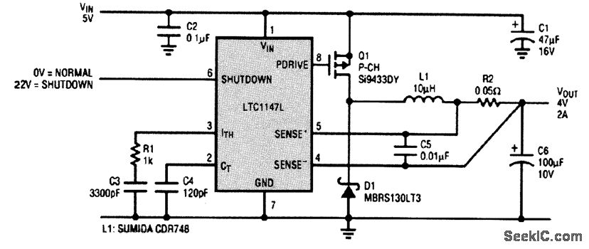 Generating a 4-V supply voltage for some of the new microprocessors from a 5-V main requires a low-voltage-loss capability in an efficient switching power supply. The LTC1147L circuit shown provides this capability in only 0.6 in2 of board space. The LTC1147L is a high-efficiency step-down switching regulator controller that provides gate drive control for an external P-channel MOSFET switch. Up to 100 percent duty cycle is possible with the LTC1147L, allowing the output voltage to be close to the input voltage. This device uses a constant off-time architecture and can operate at switching frequencies eiceeding 400 kHz. The LTC1147L is an adjustable device, with the output voltage set by an external resiator divider network. Maximum load current is set by the value of the current sense resistor R2.