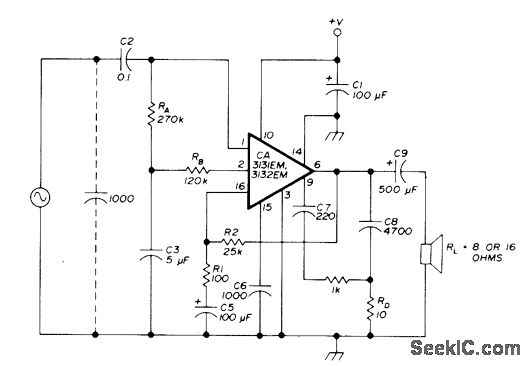 RCA IC includes preamps, power amplifier, and integral heatsink. CA3131 has internal feedback network that maintains 48-dB gain, while CA3132 requires external feedback network including R1 and R2 connected between pins 6 and 16. Input 1000-pF capacitor is required if input has open circuit. Electrolytic C1 should be placed as close as possible to pin 10,C6 sets 46-dB closed-loop gain pointat 200 kHz C7 equalizes gain for positive and negative signal swings C9 sets low-frequecy response of amplifier Recommended suppiv voltageis 24VDC,-E.Noll, Audio-Power Integrated Circults,Ham Radio、Jan 1976、p 64-66