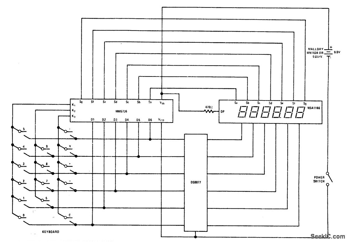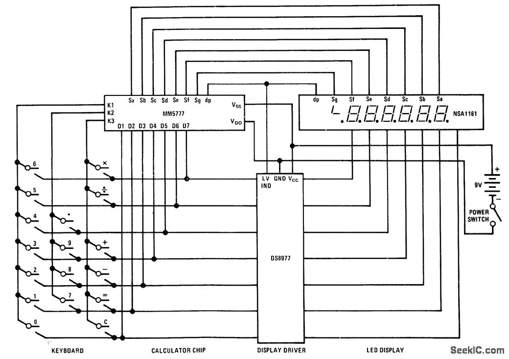 National MM5777 calculator chip requires only keyboard, NSA1161 LED display, DS8977 digit driver, and 9-V battery to provide add, subtract, multiply, and divide functions. Calculator chip includes keyboard encoding and key debouncing circuits, along with all clock and timing generators. LED segments can be driven directly, without multiplexing. Seventh digit position is used for negative sign of 6-digit number and as error indicator.Leading and trailing zero suppressionis included.-, MOS/LSI Databook, National Semiconductor,Santa Clara,GA,1977,p 8-84-8-89.