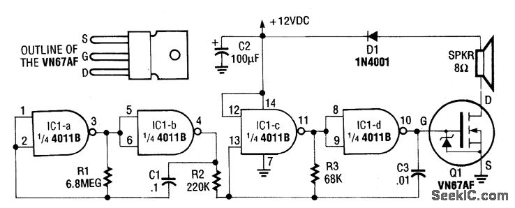 This circuit uses a CMOS chip and a VMOS FET amplifier for 6 W of audio output. 18 W of audio canbe generated usmg a+24-Vdc supply, IC1A and IC1B are used as a 1-Hz oscillator. IC1C and IC1D form a 1-kHz multivibrator that is gated by the 1-Hz signal from IC1A and IC1B.