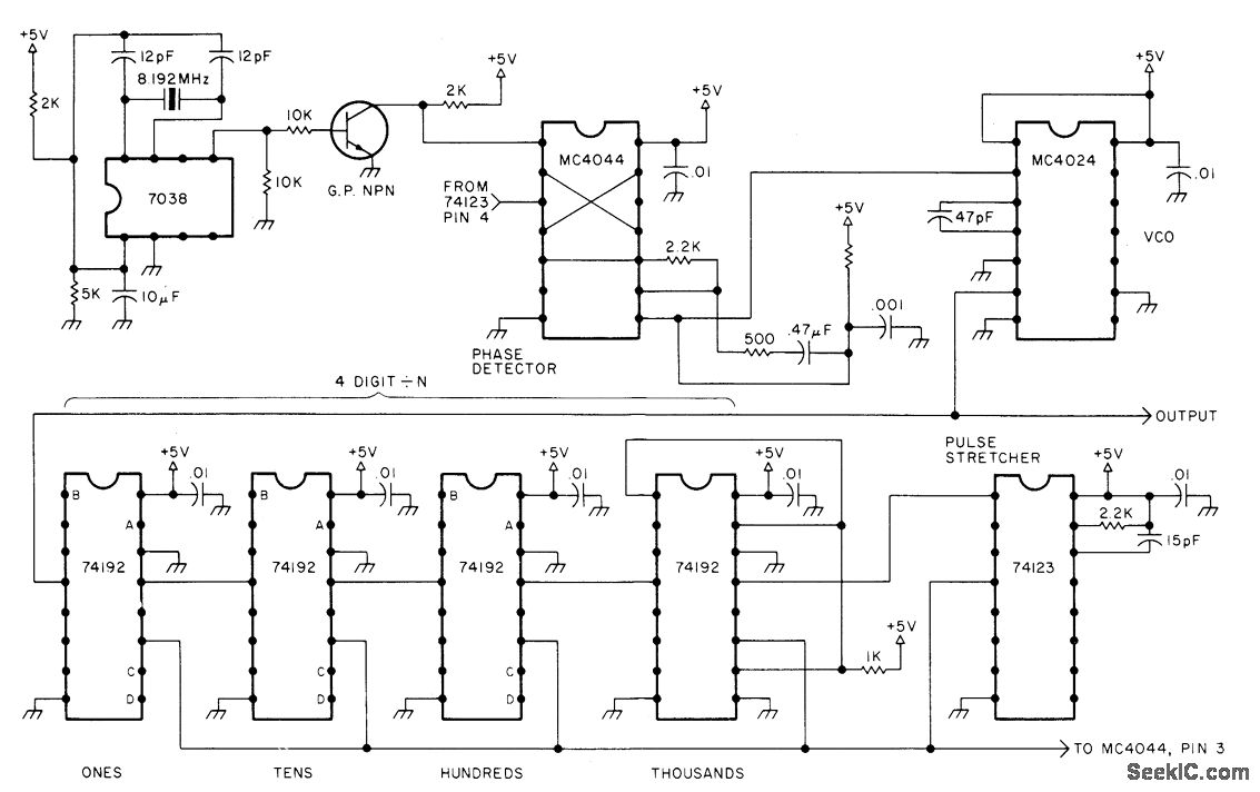 Provides output in 1-kHz steps under digital programming, except that first digit is hard-wired to 7 and does not change. VCO is Motorola MC4024, which generates square-wave output. For sineoutput, use low-pass filter at output of VCO to eliminate all frequencies above 7.999 MHz, or use different VCO. 74123 mono lengthens reset pulse generated by divide-by-N circuit. Terminals A, B, C, and D of 74192s go to grounding switches that are set to give desired division ratio, Article gives theory of PLL synthesizers YourseH!,73 Magazil,Oct,1977,p 182-188.