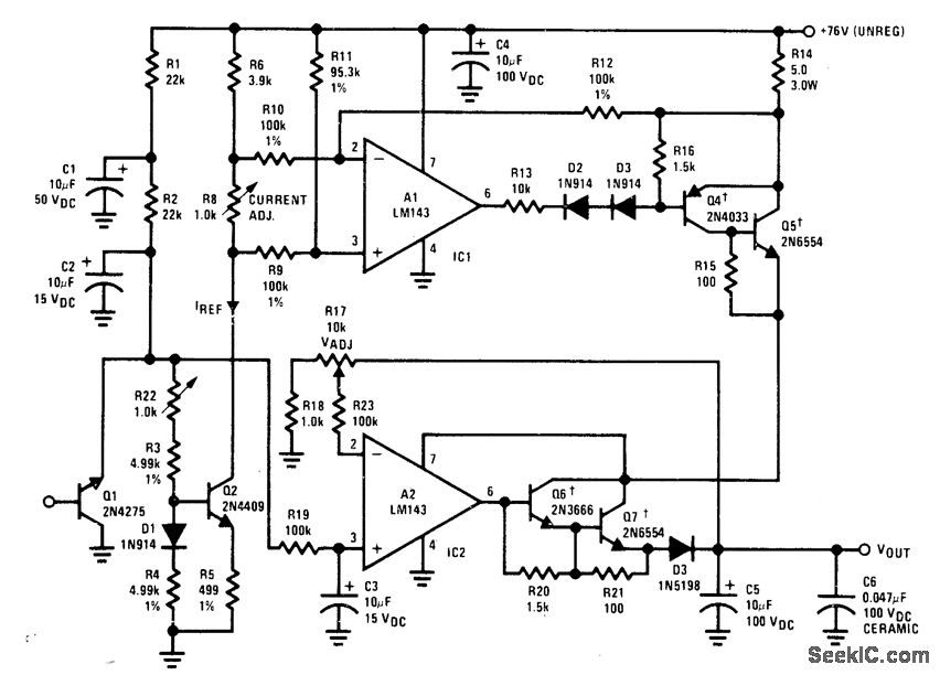Provides continuously variable output voltage and adjustable output cur-rent range. Q1 is connected as zener to give 6.5-V reference voltage. Darlington current boosters Q4-Q7 should be on common Thermafloy 60068 or equivalent heatsink. Developed for use with pulsed loads. For input volt-age range of 46-76 V, regulation is within 286 mV for 500-mA DC output.- Linear Applica-tions, Vol. 2, National Semiconductor, Santa Clara, CA, 1976, AN-127, p 8-10.