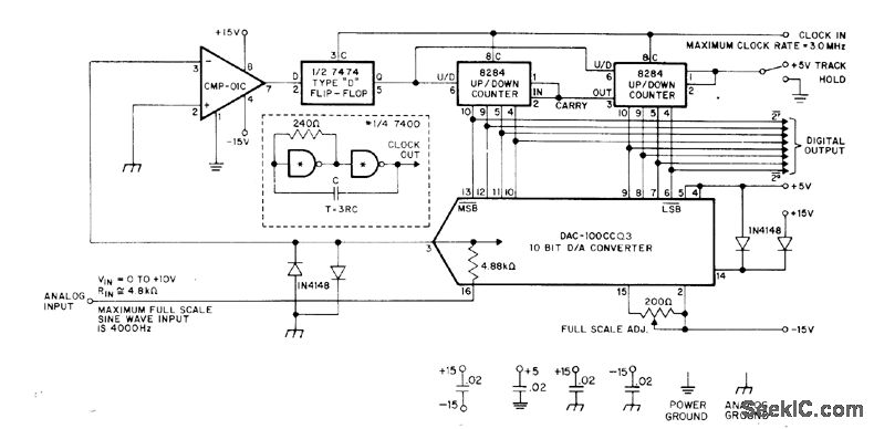 Uses Precision MonolithIcs DAC-100 CCQ3 D/A converter and CMP-01CJ fast precision comparator to make digital data contiguously available at output while tracking analog input. Diode clamps hold DAC output near zero despite input and turn-on transients.Unused least significant digital inputs of 10-bit DAC are turned off by connecting to +5 V as shown. Simple clock circuit shown in dashed box is stable over wide range of temperatures and supply voltages. D/A ionverter is used in feedback configuration to obtain A/D opera-tion.— A Low Cost, High-Performance Tracking A/D Converter, Precision Monolithics, Santa Clara, CA, 1977, AN-6.P 2.