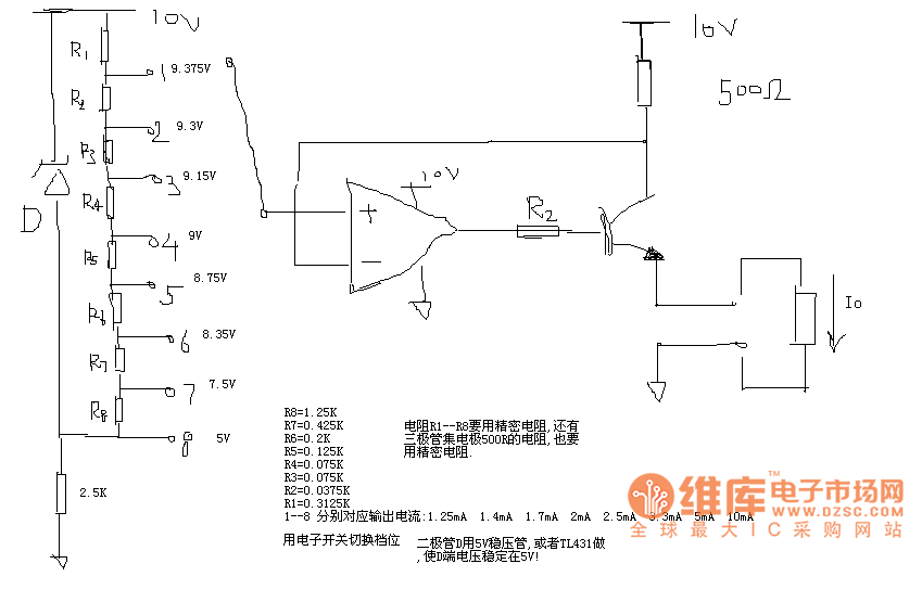 Resistors R1-R8 use precision resistors, the 500R resistors of the transistor collector also use precision resistors. Electronic switch can change the gears, the diode D uses a 5V regulator, or TL431 to make the D terminal voltage be stable at 5V.Resistors R1-R8 use precision resistors, the 500R resistors of the transistor collector also use precision resistors. Electronic switch can change the gears, the diode D uses a 5V regulator, or TL431 to make the D terminal voltage be stable at 5V.