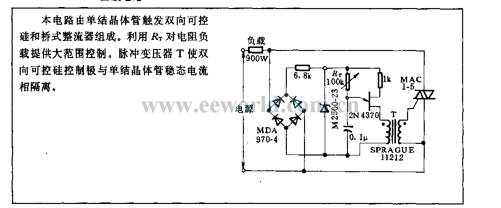 The circuit is composed ofSingle junction transistor trigger bidirectional triode thyristor and bridge rectifier. It use theRT control a wide range of resistive load . Pulse transformer T isolates the single junction transistor steady-state current and silicon-controlled rectifier control extremely.